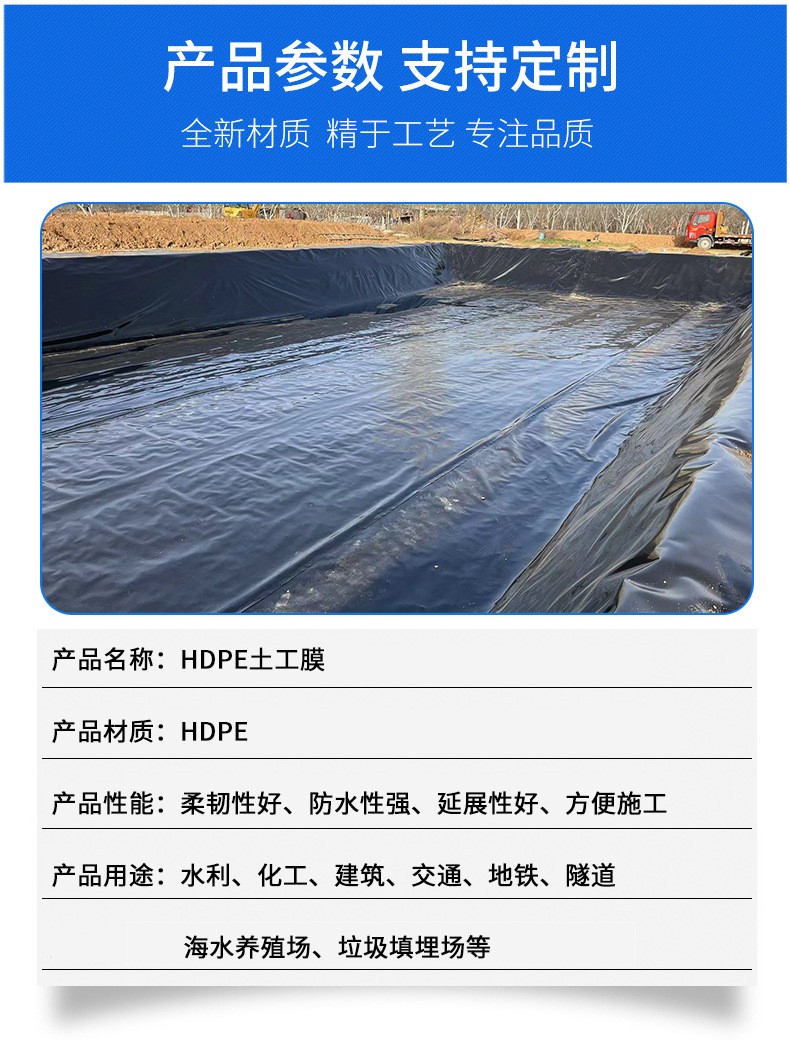 HDPE slip-resistant pillar-point textured geomembrane is an industrial anti-seepage material made from high-density polyethylene (HDPE) as the raw material. It features a uniformly distributed pillar-point structure formed through a specialized model roller calendering process. The front and back surfaces can use different material combinations, making it suitable for applications such as landfill sites, wastewater treatment tanks, and seepage prevention projects in refineries. This product is made by adding functional additives to HDPE resin and processing it through melting, extrusion, calendering, and stretching. Compared to ordinary textured geomembranes, it improves tensile strength, wear resistance, and puncture resistance by nearly three times, while significantly enhancing resistance to acid, alkali, microorganisms, and chemical corrosion. The pillar-point structure on the membrane surface increases friction with geotextiles, improving slope stability and preventing construction slippage. The product thickness ranges from 0.2mm to 3.0mm, with a tensile strength of ≥25MPa, elongation at break of ≥550%, and a seepage coefficient of 1×10⁻¹⁷ cm/s, with a service life of 40-50 years. Specifications include various thicknesses from 1.0mm to 2mm, and colors are available in black, white, or other options. Construction uses hot-weld technology, ensuring high seam strength and significantly improving installation efficiency.