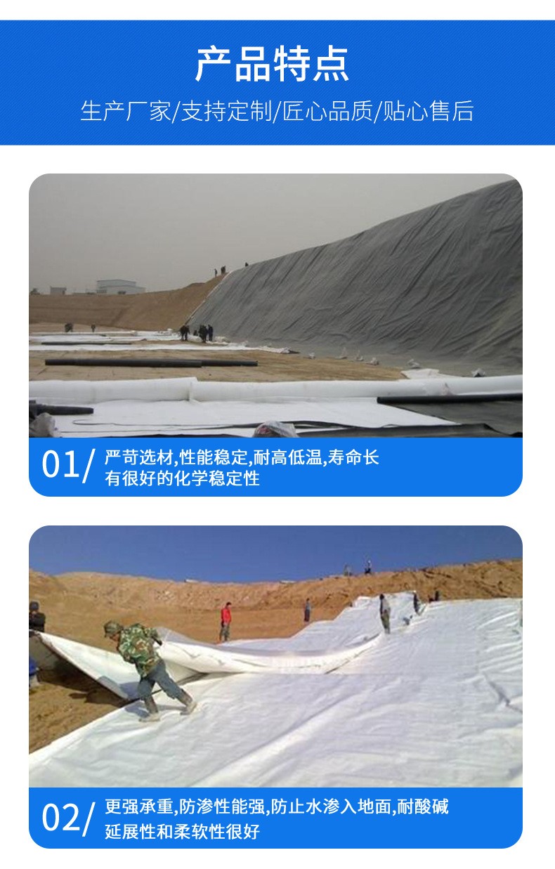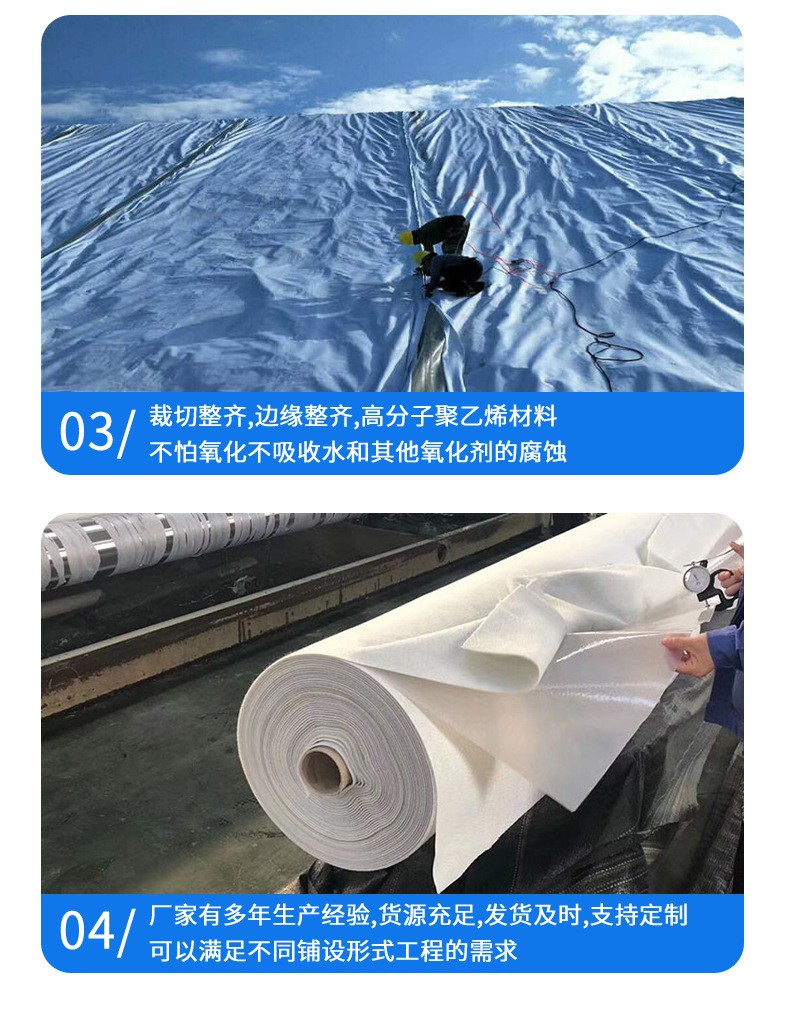 Characteristics of Composite Geomembranes: Composite geomembranes are made by hot-pressing a polyethylene geomembrane as the impermeable layer with nonwoven geotextiles that have excellent separation, drainage, and waterproof performance. Common types include one fabric-one membrane, two fabric-one membrane, or multiple fabric-multiple membrane combinations. Composite geomembranes have a width of 4-6 meters and a thickness of 200-1500 grams, with complete specifications available. They feature high strength, good elongation, high deformation modulus, resistance to acids, alkalis, and corrosion, aging resistance, good impermeability, and are unaffected by the climate. Composite geomembranes are primarily used in hydraulic dams, road construction, airports, drainage, buildings, environmental protection, water supply, and other projects. They function as impermeable barriers, protective layers, and reinforcements in engineering applications. The service life of composite geomembranes is mainly determined by whether the plastic film retains its waterproof and impermeable properties. According to Soviet national standards, a polyethylene film with a thickness of 0.2 mm and stabilized for hydraulic use can last 40-50 years in clean water conditions and 30-40 years in wastewater conditions. Therefore, the service life of composite geomembranes is sufficient to meet the requirements for dam impermeability.