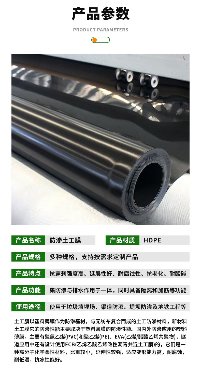 1. Environmental Engineering: Liner for landfills, sewage treatment plants, chemical wastewater ponds, power plant regulating ponds, industrial/medical waste landfills, ash disposal sites, and evaporation ponds.
