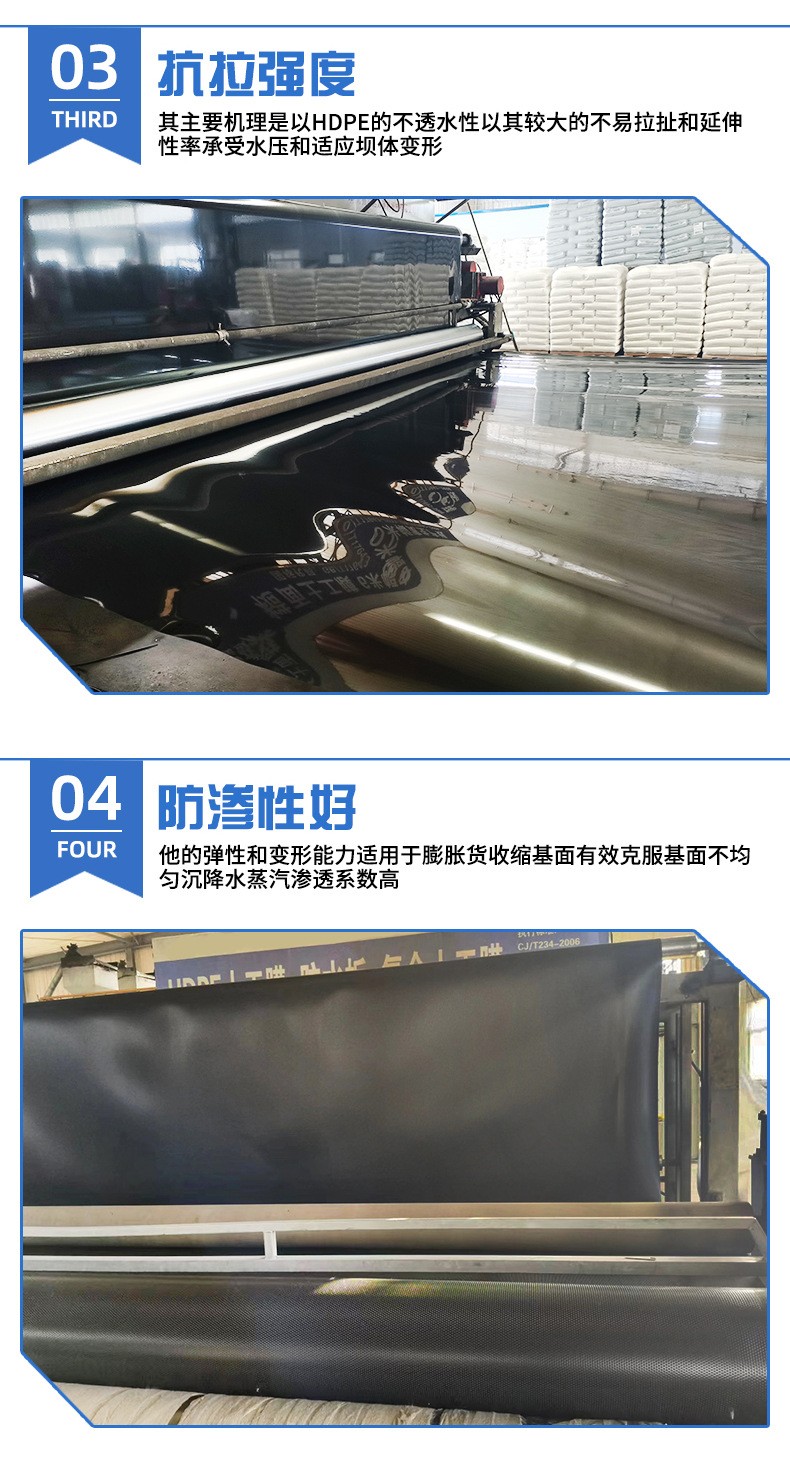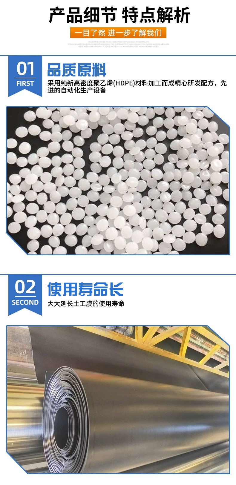 Geomembranes are impermeable materials made by combining a PE film as the base material with geotextile. Their impermeability mainly depends on the PE film. In the application of Dongfang geomembranes, they are a type of polymer chemical flexible material, with low density, high extensibility, strong adaptability to deformation, corrosion resistance, low-temperature resistance, and good frost resistance. Their main mechanism is to use the waterproof property of the plastic film to block water leakage channels in the dam, and to withstand water pressure and accommodate dam deformation through its high tensile strength and elongation.